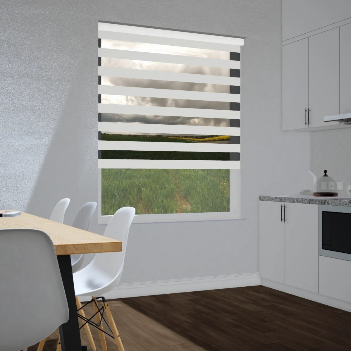 Op de dag: De duo rolgordijn wordt gemonteerd op de muur of op het kozijn, buiten de opening van het raam. Dit is ideaal als je het raam volledig wilt bedekken.