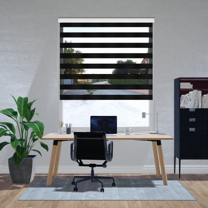 De duo rolgordijnen Elegant verduisterend in de kleur donkergrijs combineren een luxe, krachtige uitstraling met optimale verduistering en privacy. Dankzij de dubbele banen van verduisterende en transparante stof bepaal je eenvoudig de gewenste lichtinval en sfeer. De chique donkergrijze tint geeft je interieur een moderne en elegante look, ideaal voor slaapkamers of andere ruimtes waar verduistering gewenst is.